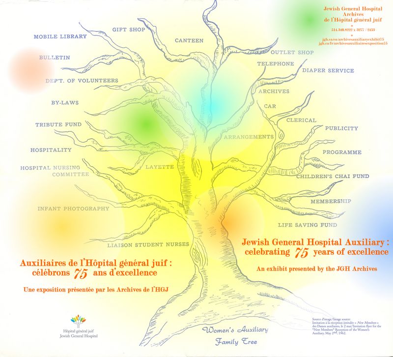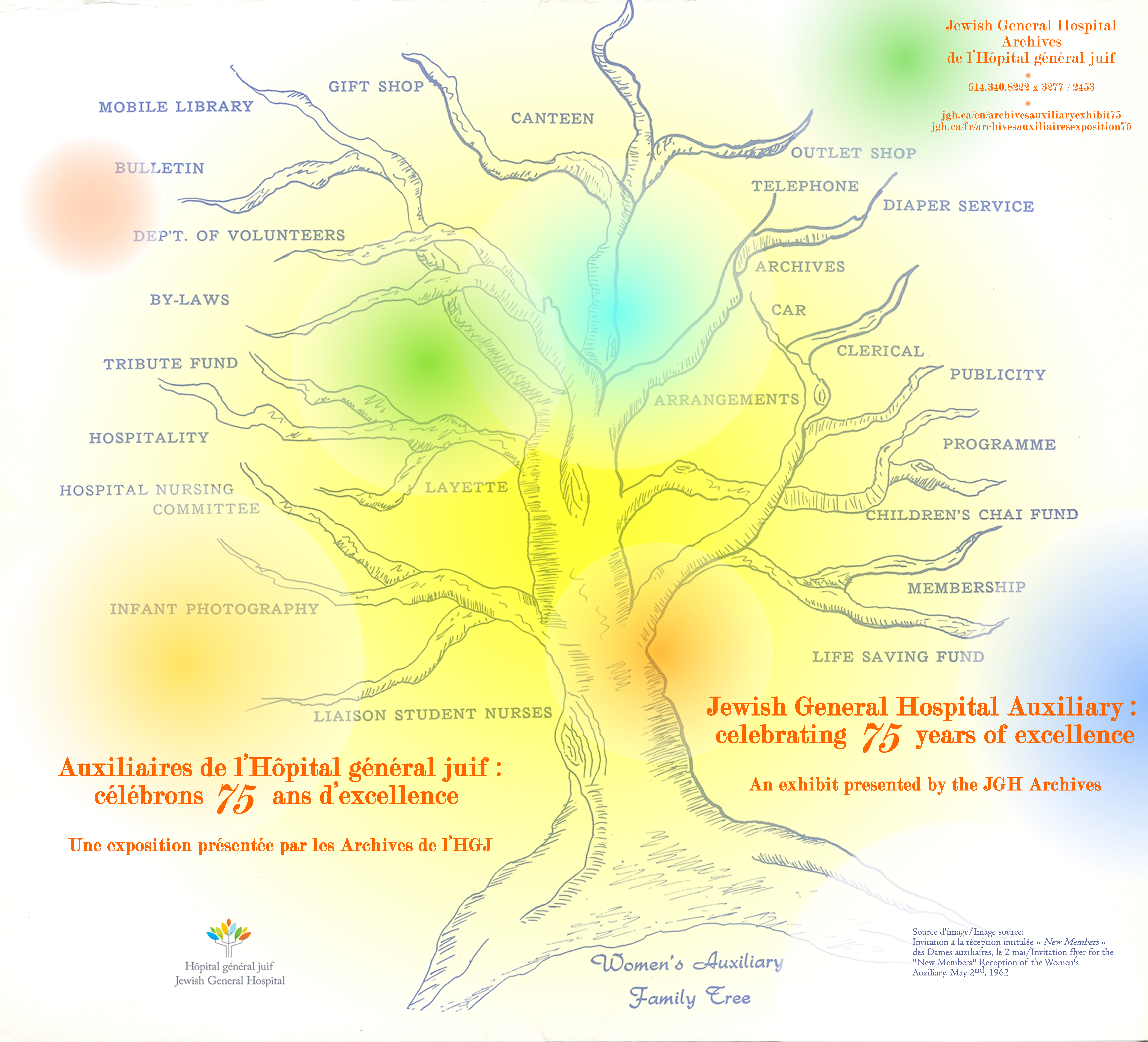 Les Dames auxiliaires de l’HGJ sont un organisme sans but lucratif fondé en 1936 dont les objectifs sont d’être une source d’encouragement pour le personnel et les patients de l’hôpital et d’amasser des fonds pour l’achat d’équipement dont l’hôpital a grandement besoin. Depuis sa création, ses bénévoles ont amassé plus de 20 millions $ et travaillé une quantité innombrable d’heures. Grâce à leurs initiatives et au soutien apporté aux divers programmes de qualité et aux départements de l’hôpital, les Dames auxiliaires jouent un rôle crucial dans l’apport de soins de grande qualité et de réconfort à nos patients. Cette tradition d’excellence se poursuit et le passé remarquable des Dames auxiliaires se reflète encore aujourd’hui. C’est avec une grande fierté que les Archives de l’HGJ offrent une exposition intitulée « Auxiliaires de l'Hôpital général juif : célébrons 75 ans d'excellence » pour commémorer le 75e anniversaire des Auxiliaires. L'exposition virtuelle est mis afin d'accompagner l'exposition physique du même nom qui est actuellement présentée dans le hall principal de l'Hôpital. Elle regroupe une galerie de photos et une collection de documents incluant des lettres, brochures et autres objets divers.