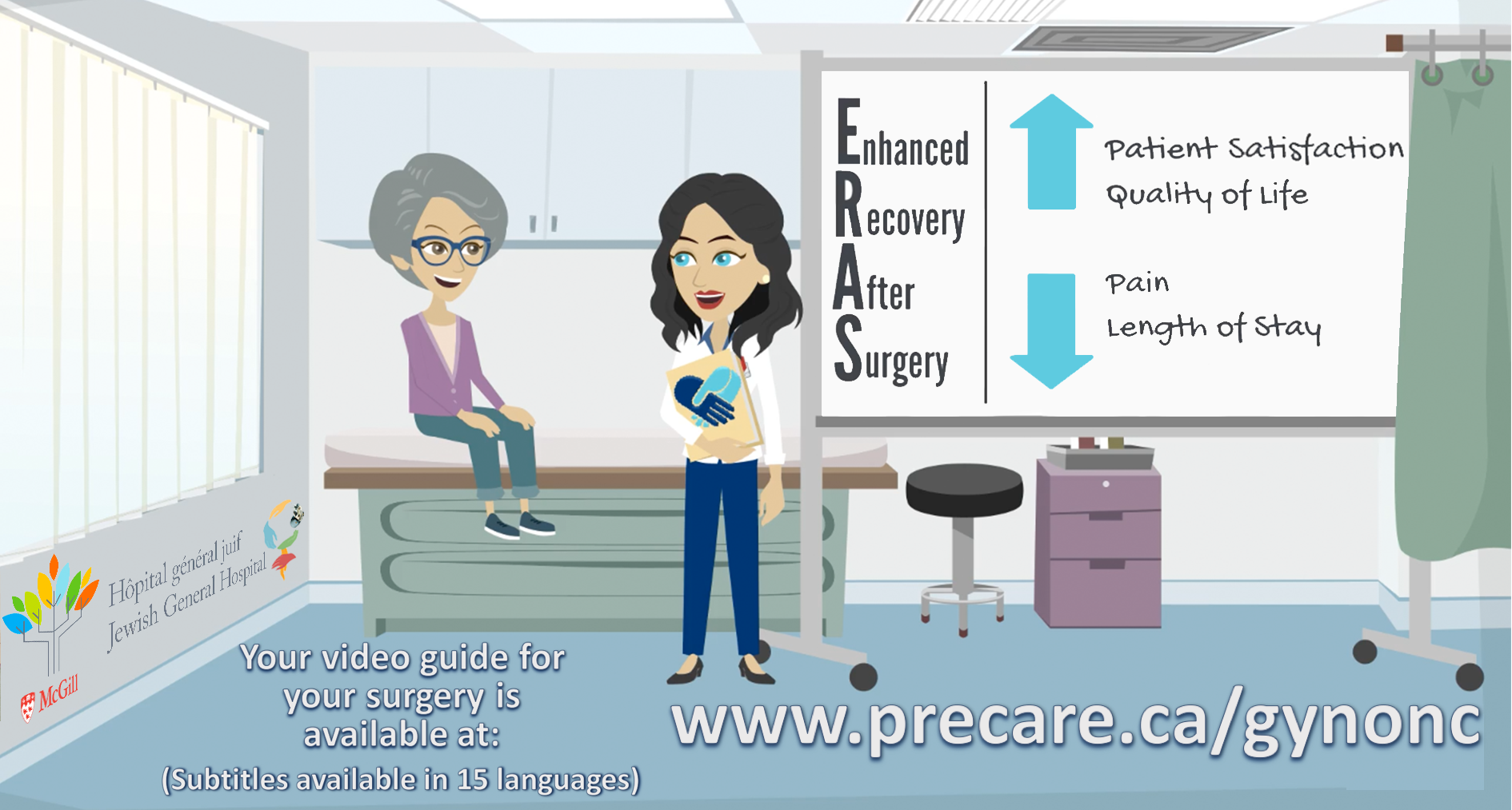 Les informations fournies par cette vidéo animée du site PreCare visent à guider les patientes d'oncologie gynécologique dans leur phase préopératoire. La vidéo montre à quoi s'attendre de leur chirurgie et explique comment se rétablir de la chirurgie rapidement et en toute sécurité, selon la voie ERAS (Enhanced Recovery After Surgery, soit Rétablissement amélioré après une intervention chirurgicale).