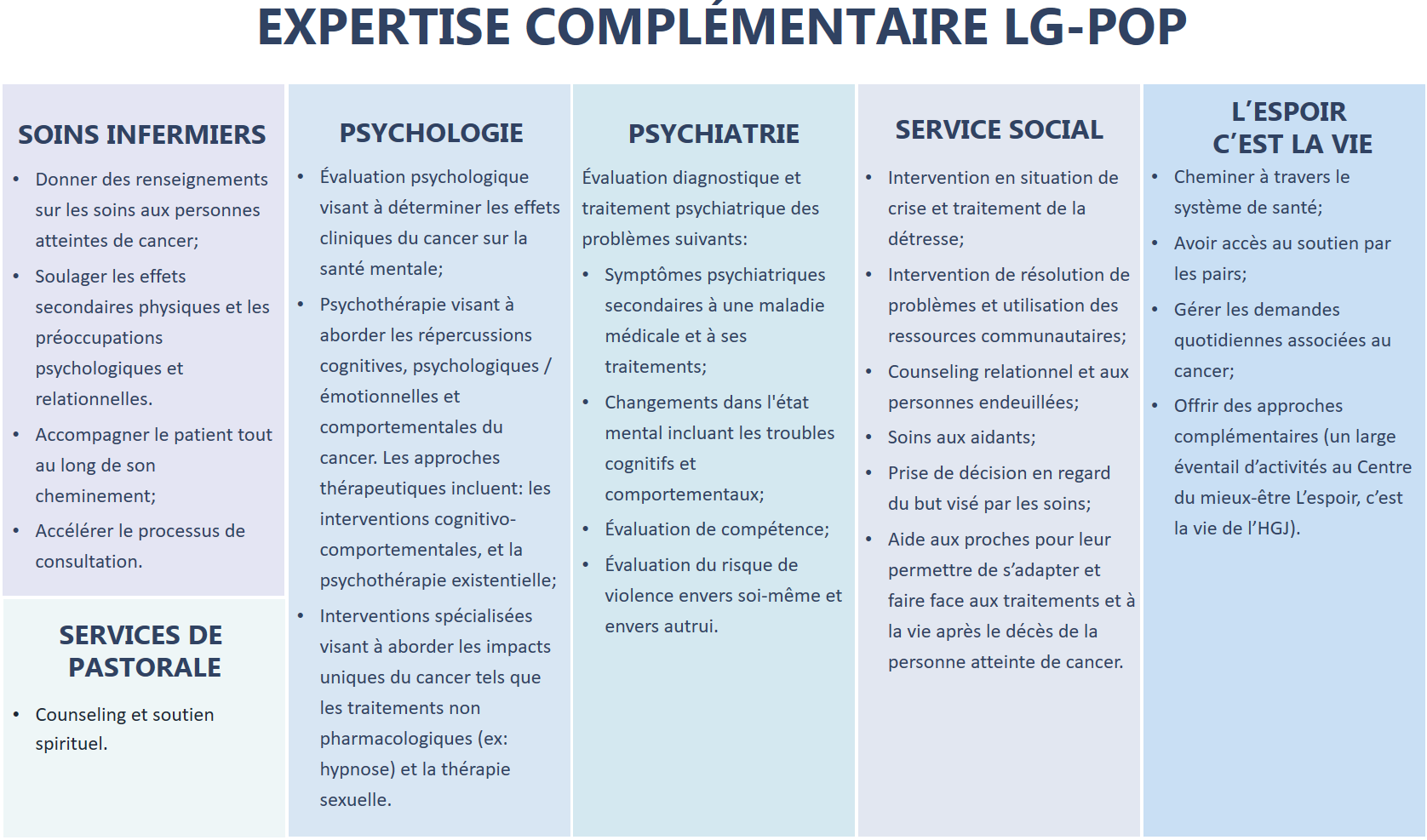 Le Programme d’oncologie psychosociale Louise Granofsky (POP-LG) a été fondé par le Dr. Zeev Rosberger, PhD, psychologue suite au don de Mini et David Granofsky en mémoire de leur fille, Louise. Il est constitué d’une équipe interdisciplinaire de professionnels spécialisé en oncologie psychosociale et travaillant dans les domaines du travail social, dans le domaine du service social, de la psychologie, de la psychiatrie, des soins infirmiers et des services de pastorale. Notre but est d’aider à apaiser la détresse des patients atteints de cancer et de leurs proches en mettant l’accent sur leurs besoins sociaux, psychologiques, affectifs, existentiels/spirituels, et fonctionnels et ce, à toutes les phases de la trajectoire du cancer.