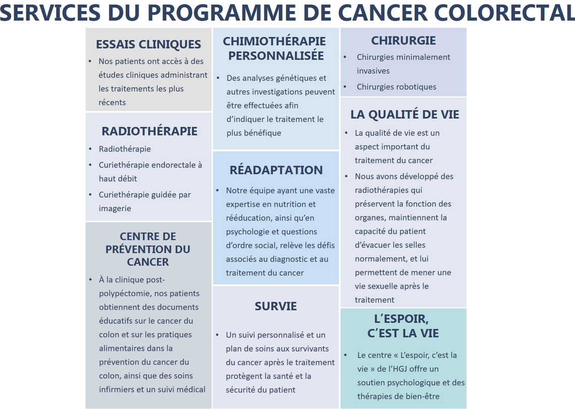 Décider du lieu où vous serez traité est une étape cruciale dans le traitement de votre cancer. L’Hôpital Général Juif est reconnu comme chef de fil dans l’introduction de nouvelles thérapies innovantes pour traiter le cancer colorectal. Cela nous permet d’offrir à nos patients un plan de traitement optimal conçu spécifiquement pour chaque patient. Chaque année nous traitons plus de 200 personnes atteintes de cancer du colon et de cancer rectal. Nous guérissons ou contrôlons la maladie chez des personnes présentant toutes les formes de cancer colorectal, des stades les plus précoces jusqu’aux formes les plus rares et les plus complexes.